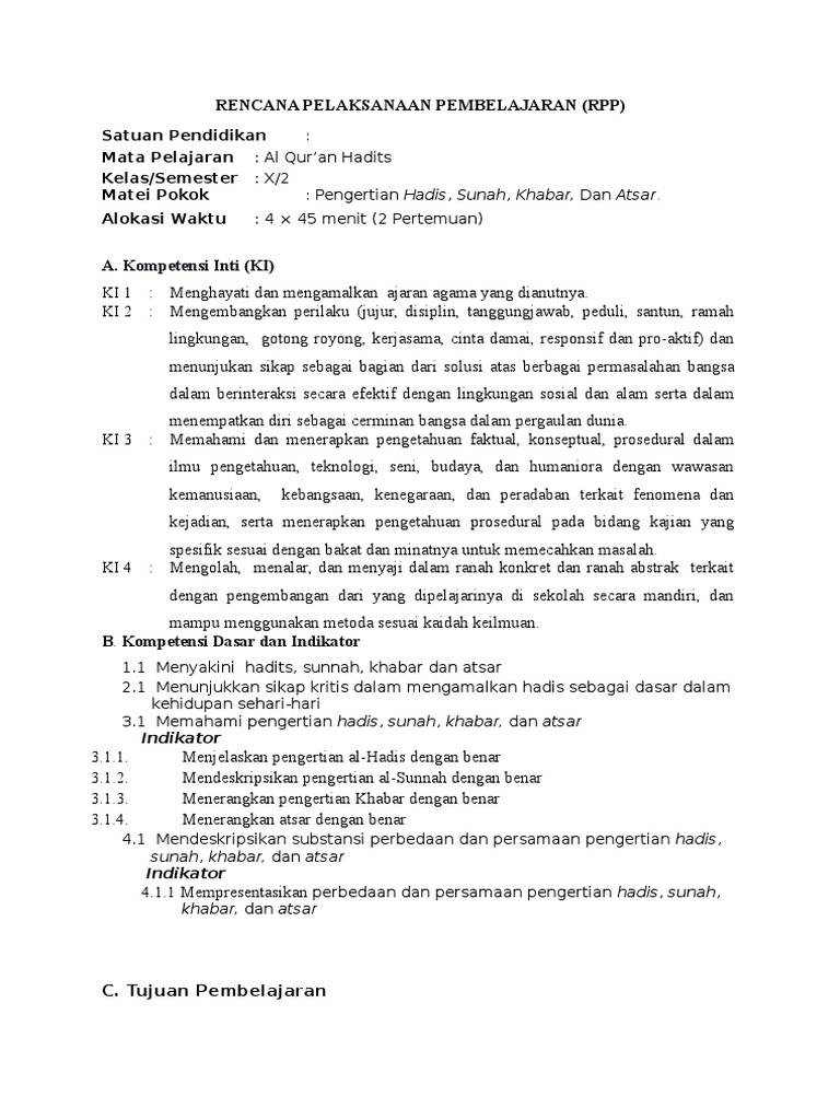 Rpp mts quran hadits kelas vii by diva pendidikan 66503 views. Rpp lengkap dan terbaru yang disusun sesuai permendikbud no 59, 103 & 104 tahun 2014. File ini dibuat dalam bentuk doc/ms word sehingga mudah di edit oleh guru. 4 x 3 jam pelajaranjumlah pertemuan.
